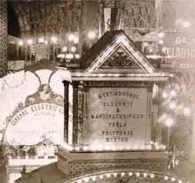 وفي سنة 1893 م، فاز جورج ويستنغهاوس بمناقصة إضاءة المعرض العالمي الكولومبي لسنة 1893 م في شيكاغو بالتيار المتردد متفوقًا على عرض جنرال إليكتريك،[94] وقد خصص هذا المعرض العالمي مبنى للمعروضات الكهربائية. كان هذا الحدث محوريّا في تاريخ التيار المتردد، حيث بيّن ويستنغهاوس لعموم الأمريكيين أمان وموثوقية وكفاءة نظام التيار المتردد.[95][96] شرح تسلا سلسلة من الموضوعات الكهربائية في المعرض الكولومبي، تحت لافتة تعلن عن «نظام تسلا متعدد الأطوار»، كان قد سبق له شرحها في أنحاء أمريكا وأوروبا،[97] وشملت استخدام الضغط العالي، واستخدام التيار المتردد عالي التردد لإضاءة مصباح مفرغ الغاز لا سلكيًا.[98]