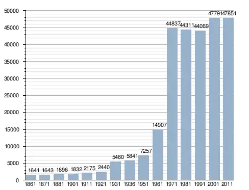 في سنة 1861 بلغ عدد السكان 1٬641 نسمة، وتطور العدد ليصل في سنة 2011 لـ 47٬851 نسمة.