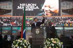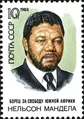 نيلسون روليهلاهلا مانديلا[16] (18 يوليو 1918 - 5 ديسمبر 2013 [17])، سياسي مناهض لنظام الفصل العنصري في جنوب أفريقيا وثوري شغل منصب رئيس جنوب أفريقيا 1994-1999. وكان أول رئيس أسود لجنوب أفريقيا، انتخب في أول انتخابات متعددة وممثلة لكل الأعراق. ركزت حكومته على تفكيك إرث نظام الفصل العنصري من خلال التصدي للعنصرية المؤسساتية والفقر وعدم المساواة وتعزيز المصالحة العرقية. سياسيا، هو قومي أفريقي وديمقراطي اشتراكي، شغل منصب رئيس المؤتمر الوطني الأفريقي (African National Congress : ANC) في الفترة من 1991 إلى 1997. كما شغل دوليا، منصب الأمين العام لحركة عدم الانحياز 1998-1999.