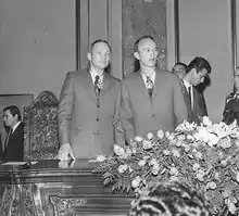 بعد أن عادوا إلى المركبة القمرية (LM) تم إغلاق الفتحة بإحكام. حينها اكتشف ارمسترونغ (Armstrong) والدرين (Aldrin) أن زر تشغيل محرك الإقلاع في بدلاتهم الفضائية الضخمة قد تعطل فقاموا باستخدام جزء من قلم، ليدفعوا بها قاطع الدائرة الكهربائية لتفعيل الإطلاق.[109] انطلقت المركبة القمرية في موعدها لترسي في مركبة القيادة كولومبيا (Columbia). عاد رواد الفضاء الثلاثة إلى الأرض بعد أن نزلوا في المحيط الهادئ لتلتقطهم حاملة الطائرة التابعة للبحرية الأمريكية يو أس أس هورنت (HornetUSS).[110] بعد أن تم إطلاق سراحه من الحجر الصحي (18 يوما) للتأكد من عدم انتقال أي عدوى أو أمراض من القمر. تم تكريم الطاقم في جميع أنحاء الولايات المتحدة وحول العالم كجزء من جولة لمدة 45 يوم (النقلة العملاقة) ثم تقدم في عرض المقام الأول إلى الفيتنام لبوب هوب 1969 USO (منظمات الخدمة المتحدة).[111] في مايو 1970 سافر ارمسترونغ إلى الاتحاد السوفييتي لتقديم محاضرة في المؤتمر السنوي 13 من اللجنة الدولية للبحوث الفضاء بعد وصوله إلى لينينغراد من بولندا، سافر إلى موسكو حيث التقى رئيس الوزراء أليكسي كوسيجينAlexei Kosygin فقد كان أول غربي يرى طيارة حاملة الصواريخ سوبرسونيك توبليف تي يو - 144 (SUPERSONIC TUPOLEV TU-144) وقد تجول في مركز غاغرين لتدريب رواد الفضاء، حيث وصفها ارمسترونغ (جزء من الترف في الطبيعة)[112] وفي نهاية يومه فوجيء بمشاهدة الفيديو المؤجل إطلاقه من سيوز 9 (soyuz9) ولم يخطر على باله أن المهمة تجري على الرغم من مضيفته فالنتينا تيريشكوفا Valentina Tereshkova وزوجها اندريان نيكولايف Andriyan Nikolayev أنهم على متنها[113]