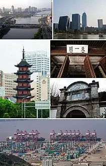 ![]() Clockwise from top: Ningbo's Skyline, Tianyi Square, Tianyi Chamber, ميناء نينغبو, جسر خليج هانغزو, and Tianfeng Pagoda | |