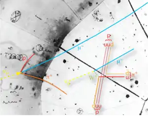(في هذا التفاعل يتفاعل مضاد النيوترينو (يسار) مع البروتون، فينتج نيوترونا وبوزيترون (+ e موجب الشحنة)