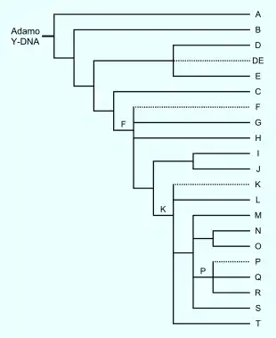 في أعلى الشكل نجد أدم الافتراضي الذي أسماه العلماء آدم صبغي واي، وهو أصل جميع الرجال الذين يعيشون الآن في جميع أنحاء الأرض. هم تفرعوا من هذا الأب. وتشير البحوث انه أنجب فصيلتين من بعده A ، BT؛ حيث حدثت في كروموسوم y طفرات (تغييرات) تفرق بينهم. ومع مرور الزمن حدثت في أنسالهم طفرات أخرى، وهي طبقا للجدول أعلاه السلالتين B , CT. وهكذا توالت الأنسال. (إن تتابع الرموز المستخدمة لا تعني شيئا هاما بالنسبة للسلالات، وإنما تتابعها يعتمد على توا ريخ اكتشاف الفصائل.)