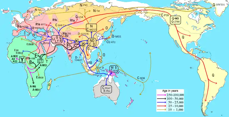 |CitationClass=تم تجاهله (مساعدة); Explicit use of et al. in:|الأخير2=(مساعدة) "we date the Y-chromosomal most recent common ancestor (MRCA) in Africa at 254 (95% CI 192–307) kya and detect a cluster of major non-African founder haplogroups in a narrow time interval at 47–52 kya, consistent with a rapid initial colonization model of Eurasia and Oceania after the out-of-Africa bottleneck. In contrast to demographic reconstructions based on mtDNA, we infer a second strong bottleneck in Y-chromosome lineages dating to the last 10 ky. We hypothesize that this bottleneck is caused by cultural changes affecting variance of reproductive success among males." - "YFull YTree". YFull. مؤرشف من الأصل في 2 مايو 2019. اطلع عليه بتاريخ 15 سبتمبر 2017. الوسيط