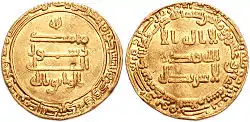 ![]() دينار الخليفة الواثق بالله ضرب بمدينة السلام عام 228هـ | |||||||