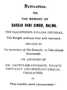 الوسيط|CitationClass=تم تجاهله (مساعدة) - Vanit Nalwa (13 January 2009). Hari Singh Nalwa, "champion of the Khalsaji" (1791-1837). Manohar, New Delhi. صفحة 21. ISBN 978-81-7304-785-5. مؤرشف من الأصل في 17 ديسمبر 2019. الوسيط
