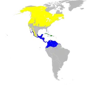 ![]() الأزرق: زائرة شتويَّة، الأخضر: زائرة شتويَّة مُفرخة، الأصفر: مُقيمة مُفرخة | |