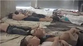 ![]() لقطة من فيديو بثه نشطاء على موقع يوتيوب لضحايا من الأطفال ويدعي أنهم توفوا بسبب تعرضهم لعوامل كيميائية. | ||||