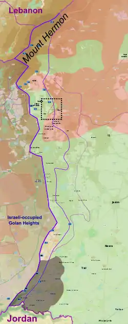 ![]() الوضع العسكري الحالي في محافظة القنيطرة. ساحة القتال ظاهرة في المربع الأسود.
