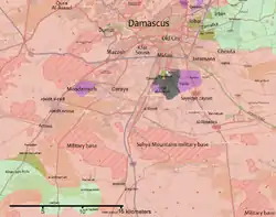![]() خريطة دمشق في أكتوبر 2016. جيب الغوطة الغربية الغربي هو في الجنوب الغربي. | |||||||