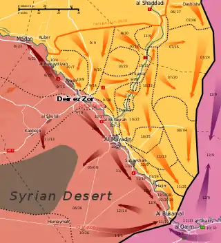 ![]() الوضع في دير الزور (25 يوليو 2018) سيطرة الحكومة السورية سيطرة تنظيم الدولة الإسلامية سيطرة قوات سوريا الديمقراطية | |||||