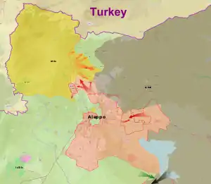 سيطرة المعارضة (بما في ذلك القاعدة في الشام) سيطرة كردية الدولة الإسلامية مواجهة مستمرة أو وضع غير واضح | |||||||