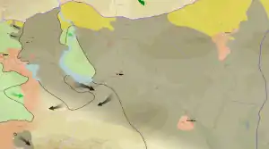 ![]() السيطرة الإقليمية قبل وبعد الهجوم. (خطوط منقطة تشير إلى الخطوط الأمامية قبل الهجوم) سيطرة الجيش السوري سيطرة المعارضة (بما في ذلك تنظيم القاعدة في بلاد الشام) السيطرة الكردية الدولة الإسلامية في العراق والشام استمرار المواجهة أو الوضع غير الواضح | |||||||||