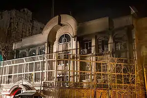 ![]() السفارة السعودية بعد حرقهاعلى يد المتظاهرين في العاصمة الإيرانية طهران | |||