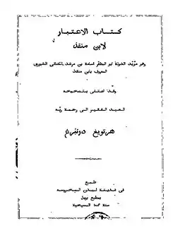 غلاف طبعة كتاب الاعتبار - «وقد اعتنى بتصحيحه العبد الفقير إلى ربه هرتويغ درنبرغ - طبع في مدينة ليدن المحروسة سنة 1884 المسيحية».