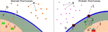 تبدأ معظم الهرمونات الاستجابة الخلويّة إما الارتباط بالمستقبلات المرتبطة بغشاء الخليّة أو المستقبلات داخل الخليّة. قد يكون للخليّة أنواع مختلفة متعددة للمستقبل والتي تتعرّف الهرمون نفسه، ولكنها تقوم بتنشيط سبل مختلفة لنقل الإشارة، أو قد يكون للخليّة مستقبلات مختلفة ومتعددة وتتعرّف هرمونات مختلفة، وتقوم بتنشيط نفس السبيل البيوكيميائيّ. مستقبلات معظم هرمونات الببتيدات وكذلك هرمونات العديد من الايكوسانويدات يتمّ تضمينها فيالغشاء البلازميّ على سطح الخليّة، ويعود معظم هذه المستقبلات إلى صنف المستقبل المقترن بالبروتين ج(م م ب ج) من البروتينات عبْرَ الغِشائِيّة اللولبيّة أَلْفا السّبعة. يُحفِّز التّفاعل بين الهرمون والمستقبل عادةً سلسلة من الآثار الثانويّة ضمن هَيولَى (سيتوبلازم) الخليّة، غالبًا يتطلّب الفَسْفَتَة (الفسفرة ( أو نَزْع الفُسْفات من البروتينات الهَيولِيّة الأخرى المتنوّعة، وتغيّرات في نَفاذِيَّة القناة الأيونيّة، أو زيادة تركيز الجزيئات الجوّانيّة ( داخل الخلايا) والتي قد تعمل كرسول ثانويّ ( مثل: أُحادِيُّ فُسْفاتِ الأَدينُوزِين الحلقيّ). بعض هرمونات البروتين أيضًا تتفاعل مع المستقبلات الجوانيّة الواقعة في الهَيولَى (السيتوبلازم) أو النّواة عن طريق الآليّة الداخليّة (عمل الهرمون داخل الخليّة). تقع مستقبلات الهرمونات الستيرويديّة أو الدرقيّة داخل الخليّة في السيتوبلازم للخليّة المُستهدَفة. تعود هذه المستقبلات إلى عائِلَة المستقبلات النَوَوِيَّة من عوامل النسخ المُنشِّطة للربيطة. لترتبط هذه الهرمونات بمستقبلاتها، يجب عليها أولاً عبور غشاء الخليّة. يمكنها عمل ذلك لأنّها ذائبة في الليبيدات. ثمّ ينتقل مركَّب الهرمون – المستقبل المشترك عبر الغشاء النوويّ إلى داخل نواة الخليّة، وهناك يرتبط بسلاسل معيّنة للحَمض الرِّيبِيّ النَّوَوي المَنزُوع الأوكسجين، وتنظيم تعبير جينات معيّنة؛ ونتيجة لذلك زيادة مستويات البروتينات المُشفَّرة بهذه الجينات.[1] ومع ذلك، فقد تبيّن أنّه ليس جميع مستقبلات الستيرويد تقع داخل الخلية. ويرتبط بعضها بالغشاء الهيوليّ.[9]