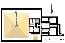 يقع مدخل الهرم على المستوى الأرضي على ناحية الشمال من الهرم ويؤدي إلى دهليز مائل . يتبع الدهليز المائل دهليز أفقي مجهز بعوائق ويؤدي إلى نظام حجرات ؛ وتكون نظام الحجرات من حجرة أمامية، وحجرة التابوت، وحجرة ثانوية يتبعها ثلاثة حجرات صغير كخازنات . تصل مساحة حجرة التابوت 3,45 × 7,90 متر وتوجد أسفل وسط الهرم بنحو 17 متر تحت مستوى الأرض.