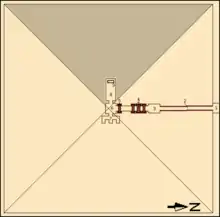 تم الحصول على الدخول إلى البنية التحتية من الجانب الشمالي للهرم ؛ ولكن على غير العادة ، يكون المدخل تحت رصيف الفناء ، بدلاً من الواجهة الشمالية. [30] كان هناك في الأصل كنيسة شمالية هنا ؛ لم يتبق منه الآن سوى آثار. [33] [34] المدخل يؤدي إلى ممر وصول مائل منحدر لأسفل من الجرانيت. [13] [35] الممر له زاوية طفيفة باتجاه الشرق ، وهو آخر ممر بني للقيام بذلك. [35] ينتهي الممر في دهليز ، يتم من خلاله الوصول إلى ممر ثانٍ مبطن بالحجر الجيري ، الممر الأفقي. [13] [35] تم اكتشاف بقايا أواني مكسورة في الدهليز ، مما يشير إلى أن بعض طقوس الدفن قد تم إجراؤها هناك. [35] تم حراسة الممر الأفقي بثلاثة أبواب من الجرانيت بالقرب من بداية الممر ، ومدخل رابع من الجرانيت بالقرب من نهايته. [35] يؤدي خروج الممر الأفقي إلى غرفة الانتظار ، وهي غرفة قياسها 4.02 م (13.2 قدم) في 3.1 م (10 قدم) إلى الشرق كانت غرفة ، السرداب ، تحتوي على ثلاث منافذ للتخزين ، سمة متطورة من سمات الأهرامات في ذلك العصر. [35] [36] إلى الغرب توجد غرفة الدفن [13] ، [13] [37] بقياس 7.84 م (25.7 قدم) × 3.1 م (10 قدم) التي احتوت ذات مرة على تابوت الحاكم البازلت. [35] تم العثور على أجزاء من التابوت في انخفاض 13 سم (5 بوصات) في الأرض. [34] تم تشييد سقف كل من غرفة الانتظار وغرفة الدفن من طبقتين أو ربما ثلاث طبقات من كتل الحجر الجيري الجملونية ، [13] [38] بنفس طريقة الأهرامات في أبوصير. [35] كانت كان طول هذه الكتل 5.25 م (17.2 قدم ؛ 10.02 متر مكعب). [39]
