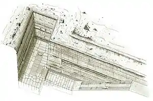 تتكون البنية التحتية من ممر دفن على شكل حرف (T)، والذي يتواجد الدهليز الخاص به على محور من الجنوب للشمال وحجرة الدفن على محور من الشرق للغرب. لا يوجد أي بقايا لسقف الممر ومن الممكن أنه لم يكن له سقف من البداية. يوجد سلم شديد الميل يقود إلى حجرة الدفن. في منتصف السلم يُوجد منطقة أفقية السطح يُجهل الغرض منها. تتميز جدران الممر بالنعومة والصقل ولكنها لم تُغطى بالحجارة أبداً ولم يتم إكمال بناء حجرة الدفن. تم إنهاء الأرضية فقط وتمت تغطيتها بحجارة جرانيتية ضخمة كل واحدة منها 4.5 متر(15 قدم) طول و2.5 متر (8.2 قدم) عرض وتزن حتى 9 أطنان. أُكتشِف تابوت حجري غير عادي بالقرب من الجانب الغربي للحجرة، له شكل بيضاوي ومُثبت بأحد القطع الصخرية التي تكون أرضية الغرفة، ويبدو أن التابوت نُقل إلى الحجرة أثناء بناء الأساسات؛ حيث أنه ضخم جدا ولا يمكن نقله في الدهليز المؤدي إلى الحجرة. أبعاد التابوت هي 3.15 متر(10.3 قدم) طول، و2.22 متر (7.3 قدم) عرض و 1.5 متر (4.9 قدم) عمق. وُجد الغطاء البيضاوي في موقعه مما يدل على أن التابوت وُجِدَ مغلقاً. وفقاً للعالم "بارسانتي" فقد وُجِدت بقايا مدفونة داخل التابوت، ولكن للأسف لم يتم فحصها بصورة أكثر دقة واليوم هي مفقوده. بالإضافة إلى ذلك، يَدَّعِى بارسانتي أنه وجد لوح إهداء مدون عليه اسم الملك دجيدف رع.