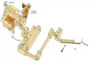 مدخل الهرم على الجانب الشرقي. يمر سلم نازل طويل عبر الكوة حيث كان من المقرر وضع أول باب. يستدير الممر يسارًا ويستمر ثم يستدير لليمين ، متجهاً الغرب مرة أخرى.