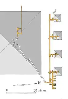 كافح دي مورغان لشهور للعثور على المدخل الأصلي ؛ بعد حفر عدة أنفاق موجهة نحو مركز النصب ، عثر أخيرًا على نفق اللصوص. تمت تغطية أحد المقاطع بـ الكتابة على الجدران التي كانت غريبة إلى حد ما عن الشرائع المصرية ، وأشهر هذه المقاطع تمثل رأسًا بشريًا تسريحة شعر مذهلة. جادل دي مورغان بأن الأنفاق والكتابات على الجدران قام بها لصوص قبور ساميون أثناء احتلال الهكسوس. من أنفاق اللصوص ، تمكن دي مورغان من تتبع المدخل الأصلي. [4]