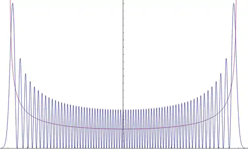 ويصف الجزء التناقص الأسي لاحتمال وجود الجسيم خارج جهد الهزاز. (في الفيزياء نشبه جهد الهزاز المؤثر على الجسيم بوجود الجسيم في "بئر جهدي"، وبهذا يكون احتمال وجود الجسيم خارج البئر صغير جدا، وهذا ما تعبر عنه الدوال الموجية الموضعية للجسيم في الشكل).