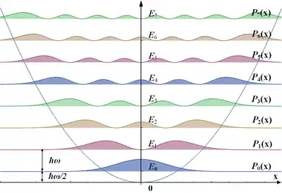 ويبين الشكل العلوي الثمانية حالات الأولى لحلول معادلة شرودنجر ، وهي تسمى الدوال الذاتية. وإلى جانب الدوال الموجية للجسيم في حالات الطاقة يصف الشكل السفلي مربع قيمة الدالة الموجية، وهو يعطي احتمال وجود الجسيم في الجهد التوافقي المفترض (والجهد التوافقي هنا موصوف بالمنحنى الأزرق).