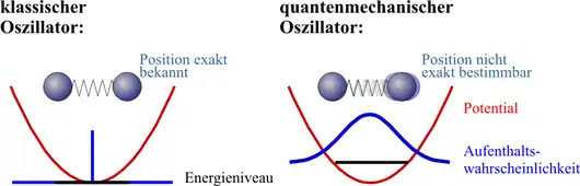 يمكن وصف خاصية وجود طاقة للجسيم الموجود جهد توافقي بالاستعانة بمبدأ عدم التأكد ل هايزنبرج التي صاغها عام 1934 باستخدامه وتطويره لميكانيكا الكم. فطبقا للحالة الكلاسيكية التي تصفها الميكانيكا الكلاسيكية لنيوتن يتخذ الجسيم المهتز الوضع و وزخم الحركة . أما في ميكانيكا الكم فلا يمكن تحديد وضع مكان الجسيم بدقة كاملة وفي نفس الوقت تعيين زخم حركة الجسيم بدقة كاملة، وإنما تتحكم في دقة تعيين هذين الاثنين مبدأ عدم التأكد لهايزنبرج. أي يكون تعيين موضع الجسيم وزخم حركته محفوفا بدرجة من عدم التأكد. أي يمكن تخيل أن الجسيم لا يكون نقطيا وإنما في هيئة " سحابة " ذات أبعاد وتحمل أقل طاقة لها ممكنة.