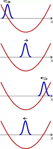 عندما نعتبر الجسيم كحزمة موجية فإنه يتصرف كما لو كان جسيما تحت تاثير جهد توافقي (لهذا نقول ان حالته هذه حالة كلاسيكية). فعندما يصطدم بحافة الجهد فإنه ينعكس عليه إلى الداخل. ويمارس بذلك تردده وأرجحته بين حافتي المجال. (يمكن تصور إلكترونا يتحرك في مجال النواة الذرية ويحصره المجال في حدود الشكل الموضح).