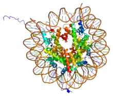 | بنك بيانات البروتينات rendering of Complex between nucleosome core particle (h3,h4,h2a,h2b) and 146 bp long DNA fragment based on 1aoi. | |||||
