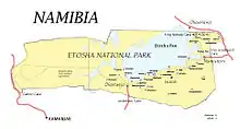 ويمكن رؤية الجبال شرق المنطقة من معسكر هلالي الموجود في منتزه وطني. وفيها بحيرة صغيرة تسمى "مورينغا" تذهب الحيوانات إليها للشرب ، ومن ضمنها الأفيال ؛ ويمكن للسياح مشاهدتهم عن قرب . وعلى الجبل الذي يقع شرقا من معسكر هلالي كان الالمان أثناء احتلالهم لناميبا ناصبين عليه برج "هليوغراف" للتواصل مع الجنود المعسكرين في قلعة "فورت ناموتوني" . ولهذا تسمى البحيرة الثانية الموجودة هناك "هيليو".