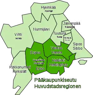 خريطة هلسنكي الكبرى (الأخضر الفاتح)، منطقة هلسنكي (الأخضر الداكن).