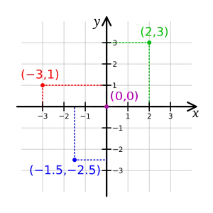 يتم تمثيل كل نقطة في المستوي ببعدها عن مستقيمين متعامدين يلتقيان في نقطة تسمى نقطة الأصل (0، 0). يسمي المستقيمان المتعامدان محوري الإحداثيات. المحور الأفقي هو المحور السيني (س) أو محور أو محور الأفاصيل، والمحور الرأسي هو المحو الصادي (ص) أو محور أو محور الأراتيب. يحدد موقع النقاط في المستوي بإعطائها إحداثيين على خطي الأعداد على صورة (س، ص) أو بالإنجليزية .
