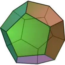 | رباعي السطوح (أربعة أوجه) | مكعب (ستة أوجه) | ثماني السطوح (ثمانية أوجه) | متعدد سطوح اثنا عشري (إثناعشر وجهً) | عشروني الوجوه (عشرون وجه) |