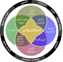 تجمع الميكاترونكس مجالات التكنولوجيا التي تشمل على أجهزة الاستشعار(Sensors) وأنظمة القياس(Measurement systems)، وأنظمة الدفع والتشغيل(Drive and Actuation systems)، وأنظمة المعالجات الدقيقة (Microprocessor systems)، جنباً إلى جنب مع تحليل سلوك النظم وأنظمة التحكم (Control systems).