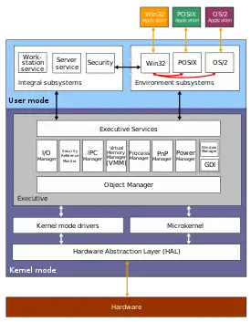 وكما تم شرحه سابقاً، يتمتع وضع kernel الخاص بنظام التشغيل Windows NT بالوصول الكامل إلى موارد الجهاز والنظام للكمبيوتر ويقوم بتشغيل التعليمات البرمجية في منطقة ذاكرة محمية.[8] علاوة على ذلك، إنه يتحكم في الوصول إلى الجدولة وتحديد أولويات الخيط وإدارة الذاكرة والتفاعل مع الأجهزة. يمنع وضع kernel خدمات وتطبيقات وضع المستخدم من الوصول إلى المناطق الحرجة في نظام التشغيل والتي لا ينبغي لهما الوصول إليها ؛ ويجب أن تطلب عمليات وضع المستخدم من وضع kernel إجراء مثل هذه العمليات نيابة عنهم.