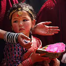 - مارسة البهاكتي أو البوجا لأسباب روحية، والتي يمكن توجيهها إلى المرشد أو لصورة إلهية.[56] والشكل العام المرئي لهذه الممارسة هو العبادة أمام تمثال. وتقول جينان فاولر على أن المراقبين غير الهندوس غالباً ما يخلطون بين هذه الممارسة وبأنها عبادة "لحجر أو عبادة الأوثان ولا شيء أبعد من ذلك"، بينما بالنسبة للكثير من الهندوس، فهي صورة تمثل رمزاً للتعبير الروحي المطلق (براهمان).[56] وقد تركز هذه الممارسة على تمثال من المعدن أو الحجر، أو صورة فوتوغرافية، أو لينغا، أو أي كائن أو شجرة أو حيوان (بقرة) أو أدوات لمهنة الفرد، أو شروق الشمس أو التعبير عن الطبيعة أو لا شيء على الإطلاق. وقد تشمل هذه الممارسة التأمل، وجابا، والعروض أو الأغاني.[56][57] وبحسب إندن تعني هذه الممارسة أشياء مختلفة لمختلف الهندوس، وقد أسيء فهمها، وأسيء تمثيلها كعبادة للأصنام، وقد تم بناء العديد من التبريرات من قبل علماء الهندية الغربيين والهنود.[58]