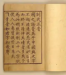 | هانغل | 훈민정음 (بالكورية الحديثة) 훈〮민져ᇰ〮ᅙᅳᆷ (بالكورية الأصلية) |