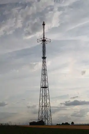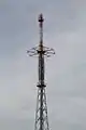Sendeturmspitze mit rotem Ringausleger und acht vertikalen Reusenseilen[1]
