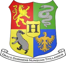 ![]() شعار هوجورتس يجمع بين شعارات بيوتها الأربعة: الأسد لجريفندور وغُرَيْر هافلباف ونسر رافينكلو والثعبان لسليذرين. | |