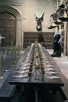 في حين أن طلاب السنة الثانية والأكبر قد وصلوا بالفعل إلى القاعة الكبرى لبدء مأدبة بداية العام، فإن الوافدين الجدد يصلون لاحقًا، برفقة المدير المساعد الذي استقبلهم سابقًا في صالة المدخل، في شرح لهم كيف يعمل توزيع التلاميذ في البيوت المختلفة على دراستهم بالكامل.[51]