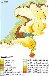 يقع حوالي نصف مساحة أراضي هولندا تحت مستوى سطح البحر في منطقة يقطنها حوالي 21% من إجمالي السكان، بينما يقع نصف أراضيها الآخر في أقل من متر واحد (3.28 قدم) فوق مستوى سطح البحر.[23] وهذه السمة الجغرافية هي التي أعطت للبلاد اسمها: الأراضي المنخفضة (بالهولندية: Nederlanden). معظم الأراضي المنخفضة الواقعة تحت مستوى سطح البحر كانت بفعل الإنسان نتيجة عمليات استخراج الخث (وهو نوع من النباتات المتفحمة) الجائرة التي دامت عدة قرون وعلى نطاق واسع، وعن طريق التجريف حتى في المناطق المغمورة بالفيضانات، مما أدى إلى انخفاض الأرض عن مستوى سطح البحر. وفي أواخر القرن السادس عشر الميلادي بدأت عمليات استصلاح الأراضي البحرية، وتم الحفاظ على مساحات كبيرة من هذه الأراضي حتى الآن من خلال أنظمة تصريف للمياه بالسدود والقنوات ومحطات الضخ. وتتشكل معظم أراضي هولندا من مصبات ثلاثة أنهار أوروبية مهمة، والتي تشكل مع أفرعها دلتا الراين - الماس - سخيلده. ومعظم مساحة البلاد مسطحة جداً باستثناء بضعة سفوح تلال منفردة في أقصى الجنوب الشرقي، وسلسلة تلالية قليلة الإرتفاع في الأجزاء الوسطى.