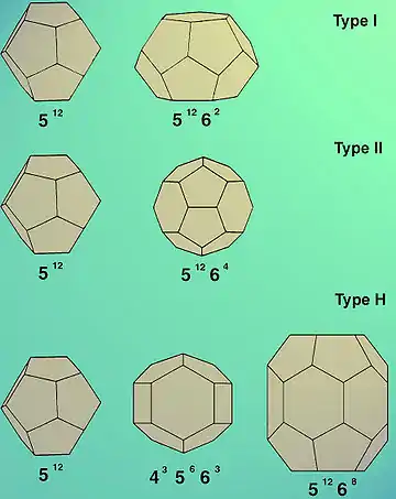 أما النمط H من بنى الهيدرات الغازية فتحوي فيه وحدة الخلية 34 جزيء ماء، مشكّلة ثلاثة أنواع من الأقفاص، اثنان صغيران من نوعين مختلفين، وآخر واسع الكبر. في هذه الحالة تتألف وحدة الخلية من ثلاثة أقفاص صغيرة من النوع 512، واثني عشر قفصا صغيرا من النوع 435663، مع وجود قفص واحد واسع الكبر له النوع 51268. يتطلب تشكيل هذا النمط من البنية البلورية لهيدرات الغاز وجود غازين، أحدهما كبير والآخر صغير، من أجل ثباتية هذه البنية. يمكن لهذه البنية أن توجد عند هيدرات غاوات مثل البوتان وهيدروكربونات أخرى قريبة.