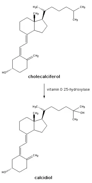 ![]() تحول كوليكالسيفيرول إلى كالسيفيديول والذي يحفز بواسطة CYP2R1. |