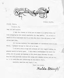 - Hulda Stumpf, Letter to G.K. Sample, 26 October 1906, courtesy of Wheaton College. نسخة محفوظة 12 أكتوبر 2013 على موقع واي باك مشين.
