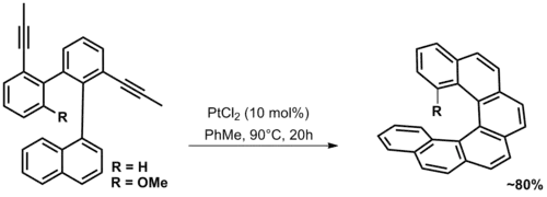 هناك أيضاً أسلوب آخر لا يعتمد على التحفيز الضوئي ومبني على تجميع مركبات بيفينيليل النفثالين وإجراء تفاعل تحلق تصاوغي مضاعف بشكل يؤدي إلى الحصول على عدة مركبات من [6]هيليسين:[13]