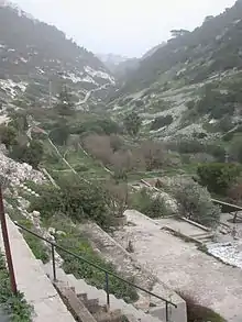 يحوي الوادي على آثار كنيسة صليبية، ودير للرهبان الكرمليين عند سفحه الجنوبي يعود تاريخه للقرن السادس. وتقع أسفل الوادي "عين السياح" وهي مياه نقية تتوزع باتجاه بستان الخياط، وهو بستان يعود تاريخه إلى أوائل القرن العشرين، قام بإنشائه عزيز الخياط على طريقة فن البساتين العربية والإسلامية، حيث يحوي بداخله على برك تجميع مياه، وشلالات ماء، ونوافير، ومدرجات وقنوات متشعبة تربط أجزاء البستان، وتسقي أشجار الرمان، والتين، والتفاح، والتوت وغيرها.[6]