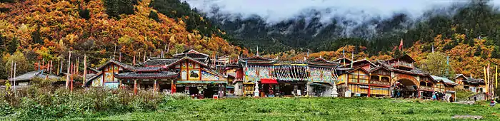 يقع في أعماق جبال مينشان الشامخة بولاية آبا الذاتية الحكم لقوميتي التبت وتشيانغ في مقاطعة سيتشوان، تبعد 450 كيلومترا عن مدينة تشنغدو، عاصمة مقاطعة سيتشوان، جنوبا، تمتد أكثر من 40 كيلومترا، إجمالي مساحتها أكثر من 60 ألف هكتار، بينما يبلغ إجمالي طول الأودية الثلاثة الرئيسية أكثر من 60 كيلومترا. في الماضي، كانت منعزلة عن العالم بسبب المواصلات الصعبة، وتقع 9 قرى تبتية فيها فقط، لذلك سميت "جيوتسايقوه" (وادي التسع قرى).