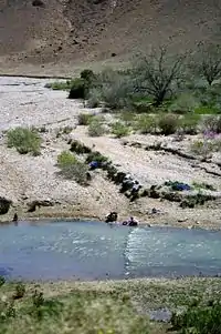 غسيل الملابس على ضفاف نهر دادس في فج دادس، المغرب.