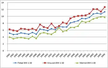بناءً على هذه الأرقام، كانت الاتجاهات غير حاسمة، على الرغم من أن أكثر من 10٪ من الفئة العمرية تعاني من البدانة، لا يبدو أن البدانة تمثل مشكلة.[29]